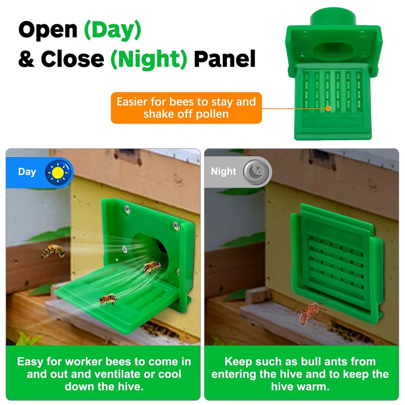 - Open and Close Panel Design: Our hive door is designed with a snap panel for controlling the hive door on and off. During the daytime, open the panel to make it easy for worker bees to come in and out to collect honey, and also to ventilate and cool down the hive. At night, the panel is closed to prevent such as bull ants from entering the hive and to keep the hive warm. When the panel is open, it also makes it easier for bees to stay and shake off pollen
