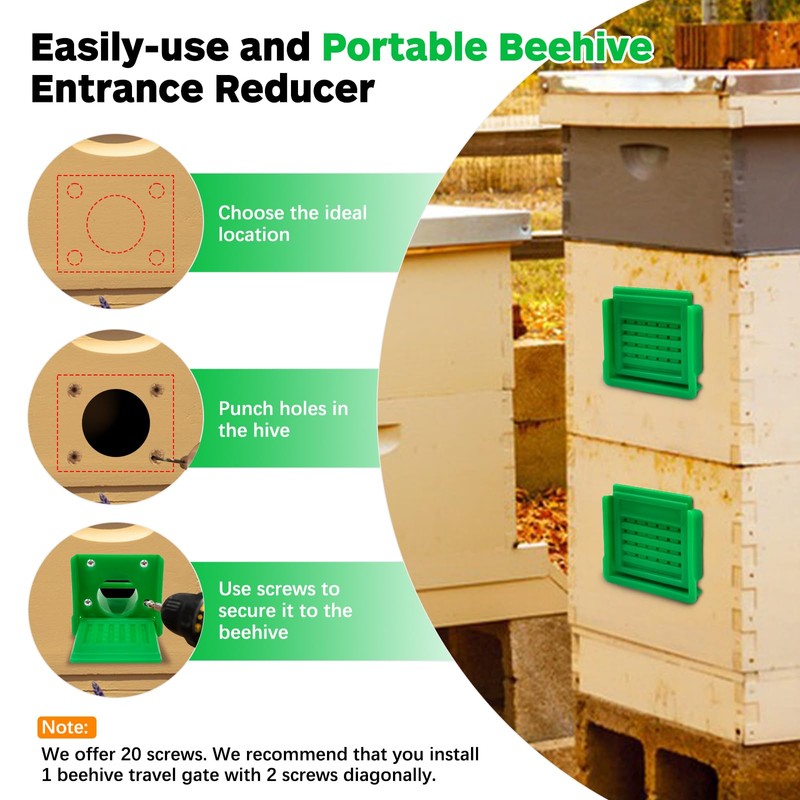 - Essential Beekeeping Supplies and Tools: For one such beautiful price, you can get up to 6 square bee hive entrance reducers, convenient for you to use and replace for multiple hives. For your convenience, we also give you 1 pack (20pcs) of mounting screws for easy installation. (We recommend 2 screws for a single bee hive entrance reducer, diagonal installation is sufficient) We sincerely wish you more and more full peak colonies and larger beekeeping scale