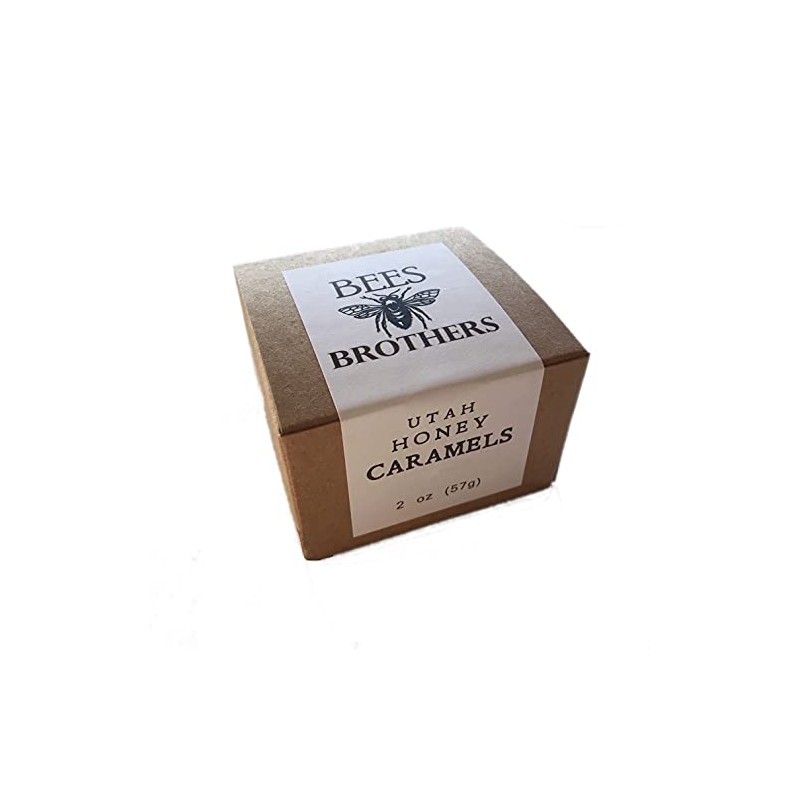 approximately 8 caramels, and is packaged in a 3 by 3 by 2 inch natural kraft