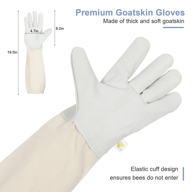 - PROFESSIONAL BEEKEEPING GLOVES:The beekeeping gloves we offer are made of thick and soft goatskin and fine imitation cotton. The elastic cuff design plays a good sealing role to ensure that bees do not enter and provides sufficient protection for hands when operating smoker or hive tools.