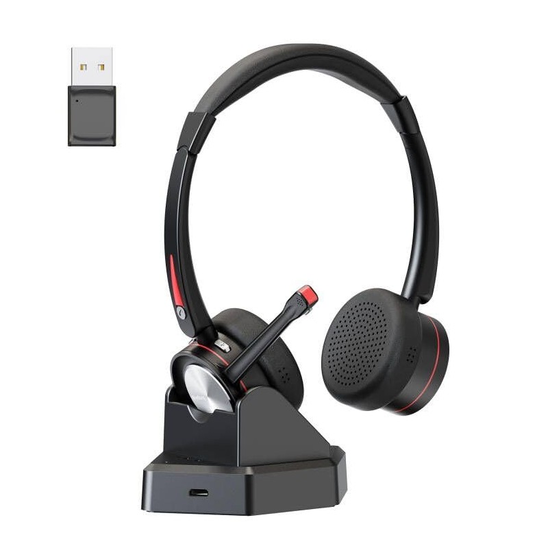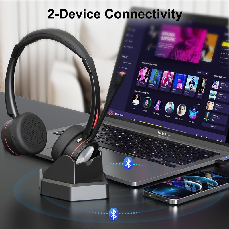 - BLUETOOTH 5.2 & MULTIPOINT-PAIRING : The wireless Bluetooth headset employs QCC 3024 Bluetooth 5.2 technology for faster pairing, stable connection, and lower battery comsumption. Enjoy the flexibility of dual connections for simultaneous calls and music playback across various devices. Plus, the included USB dongle ensures wide compatibility, making it perfect for PC users and those without built-in Bluetooth functionality.