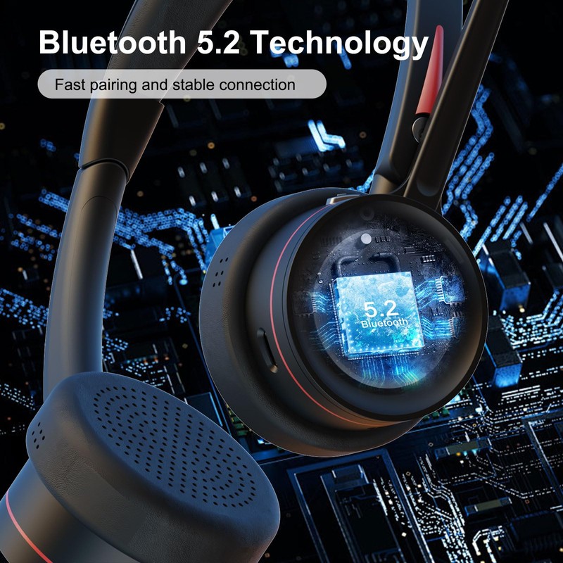BLUETOOTH 5.2 & MULTIPOINT-PAIRING : The wireless Bluetooth headset employs QCC 3024 Bluetooth 5.2 technology for faster pairing, stable connection, and lower battery comsumption. Enjoy the flexibility of dual connections for simultaneous calls and music playback across various devices. Plus, the included USB dongle ensures wide compatibility, making it perfect for PC users and those without built-in Bluetooth functionality.