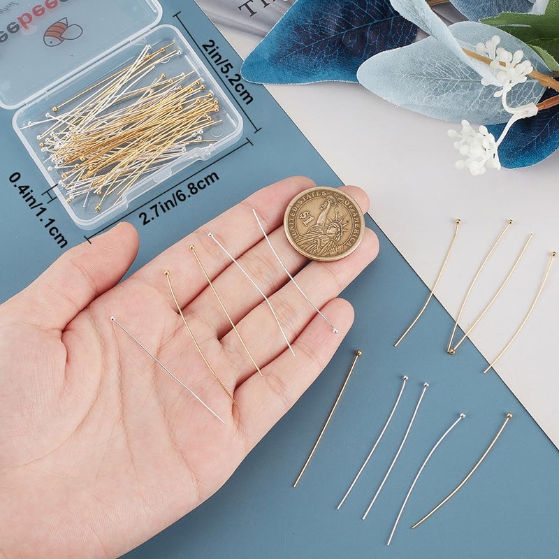 - 100Pcs Pins In A Box: Comes with 100pcs ball head pins in 2 sizes, 50pcs each size. Gold pin: 50mm(1.97 inch) long, head: 0.07in(1.8mm), pin: 0.5mm, 24 gauge; silver pin: 50.5mm(1.99 inch) long, head: 1.8mm, pin: 0.6mm, 22 gauge