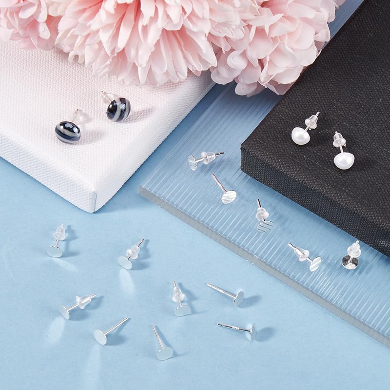 Beebeecraft 1 Box 20Pcs Flat Pad Stud Earring Settings 925 Sterling Silver Earring Cabochon Settings with 50pcs Ear Nuts and 1Pc Silver Polishing Cloth for DIY Jewellery Making Kit (Tray: 5mm)