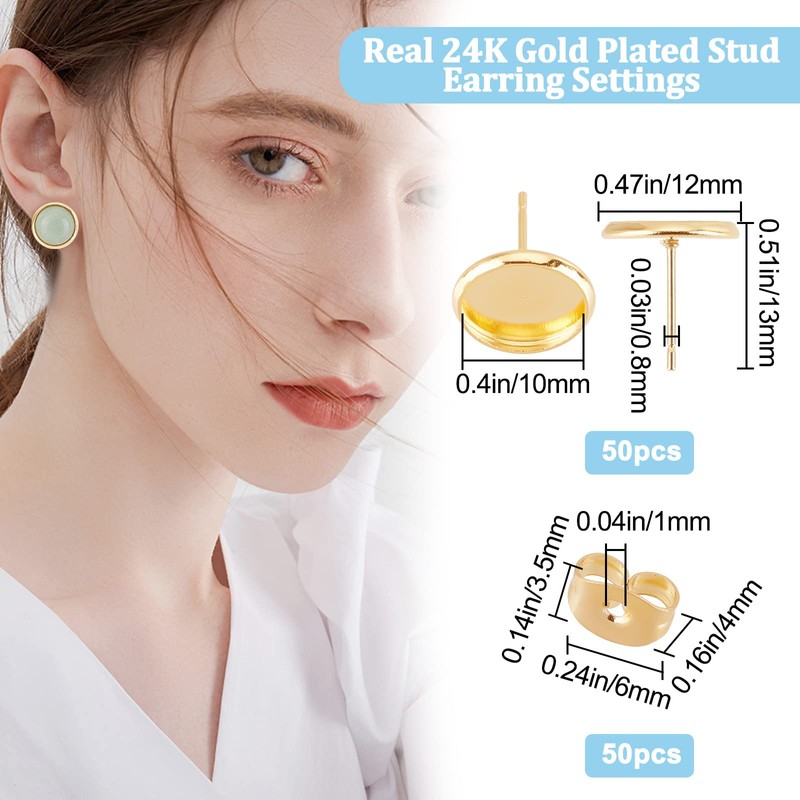 Beebeecraft 1 Box 50Pcs Earring Bezel Blanks 24K Gold Plated Stud Earrings Blanks 10mm Cabochon Bezel Settings with Earring Backs for Earring Jewelry Making