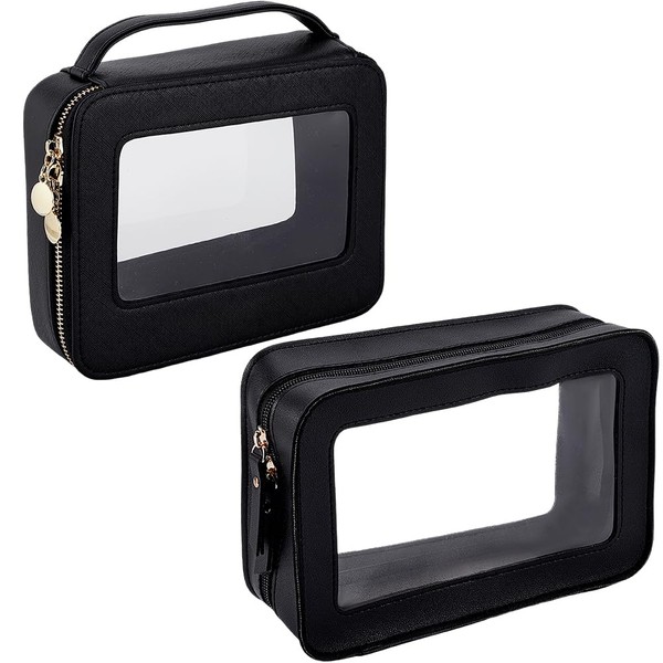 Beebeecraft 2Pcs 2 Styles Popvibe Clear Makeup Bag Rectangle Black PU Cosmetic Organizer Case Waterproof Travel Toiletry Bag Pouches with Zipper Handle PVC Windows