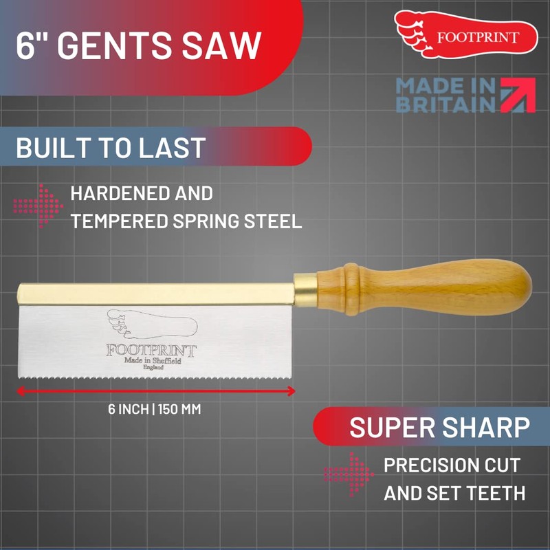 Beechwood Handle 6" Gents Saw - by Footprint Tools. Hardened and Tempered Spring Steel Blade with Fine Tooth for Woodworking. Handsaw/Wood Saw/Small Backsaw Perfect for a Mitre or Dovetail Cut.