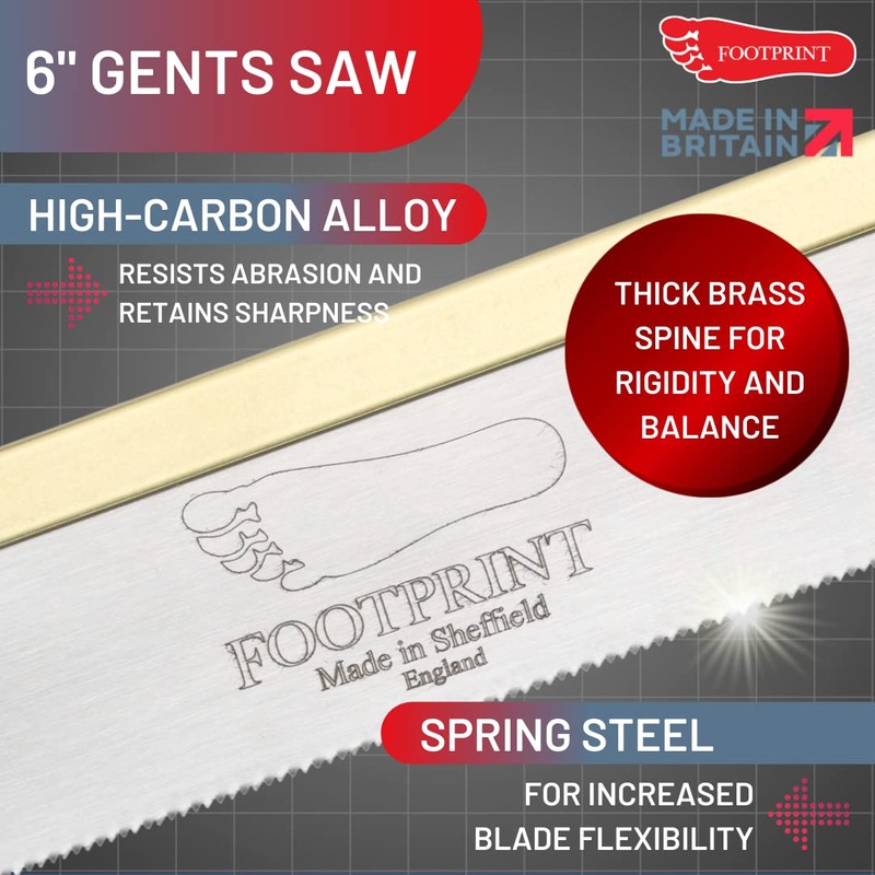 - ✅LONG-LASTING SUPER STRENGTH - As with all Footprint tools, this small 6 inch woodworking saw is a quality piece that has been built with strength and longevity in mind. It's placed in a furnace during the hardening process and then tempered to make the fine "razor" teeth easy to sharpen and difficult to blunt, maintaining the sharp edge for longer. The high carbon spring steel means a high yield strength and no brittleness. Great for any delicate work and designed to cut on the push stroke.