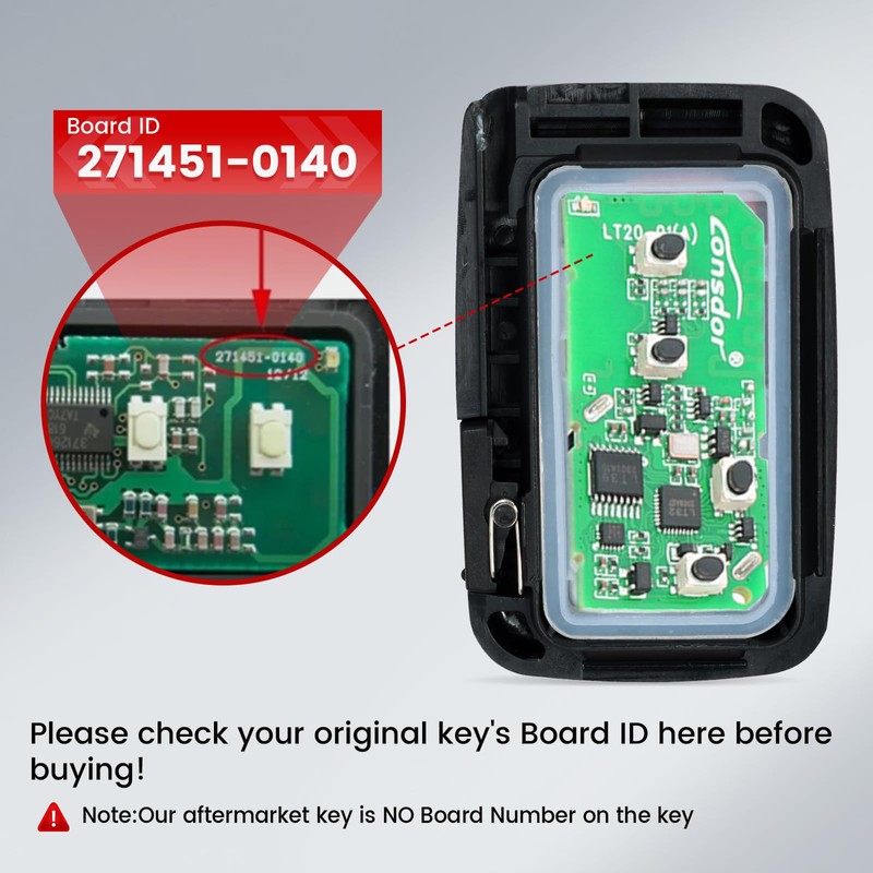 - 【Notice】 This key must be cut and programmed at a professional auto locksmith. Please match the “271451-0140” Board ID from original key to verify this part is compatible with your vehicle
