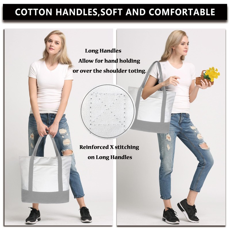 - 【LARGE CAPACITY & DURABLE】: 21" L x 15"W x 6"H, the beach tote bag is made of 100% 12oz thickness cotton canvas, big enough to hold all your daily accessories including clothes, documents, lunch boxes, drinking, and snacks. All seams are reinforced and sewn to ensure their durability, including cross-stitching at the handles for maximum strength. The two reinforced handles sized 1.4" W x 25" L, which is easy to carry or slung over on shoulder.