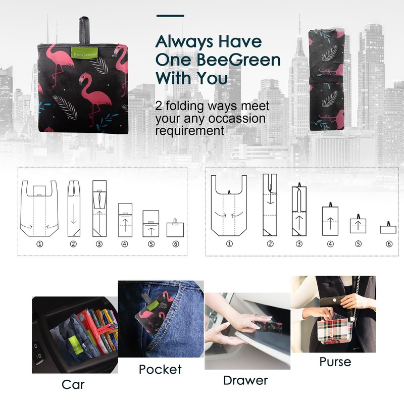2. EASY TO CARRY AROUND: Takes you less than 10 seconds to stuff the bags. While reusable shopping bags are folded, it fits easily into your purse or left in the car and do not take up any room.