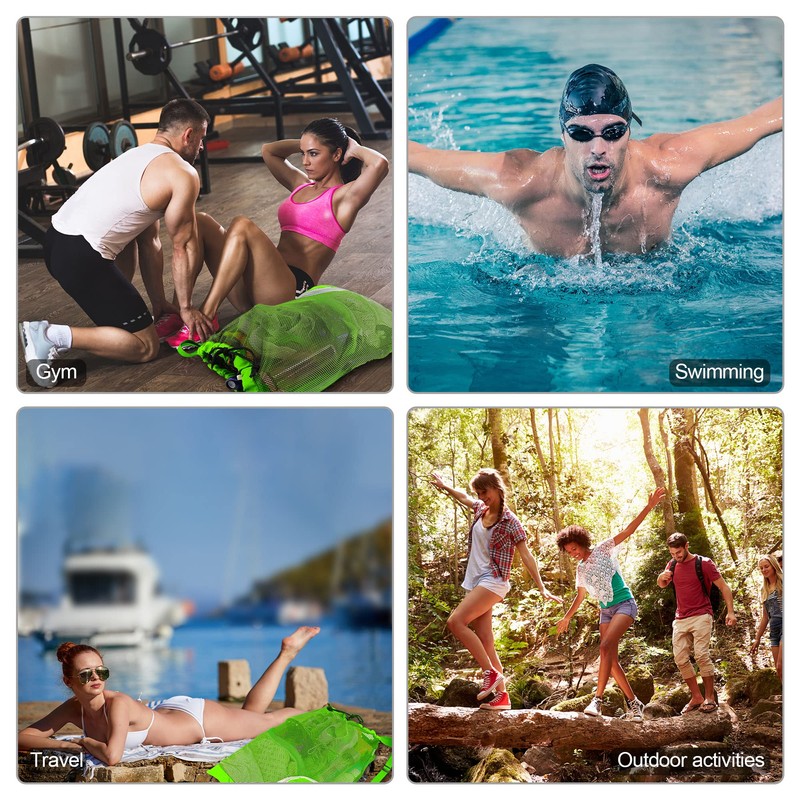 - MESH CONSTRUCTIONS & KEEP CLEAN: Our swimmers bag Design keeps sand and water away for quick-drying, allows you to find what you need quickly, such as beach towels, shoes, swimsuits, sunglasses, goggles, snacks, etc. Great companion for the gym, swimming pool, beach travel, outdoor activities, etc.