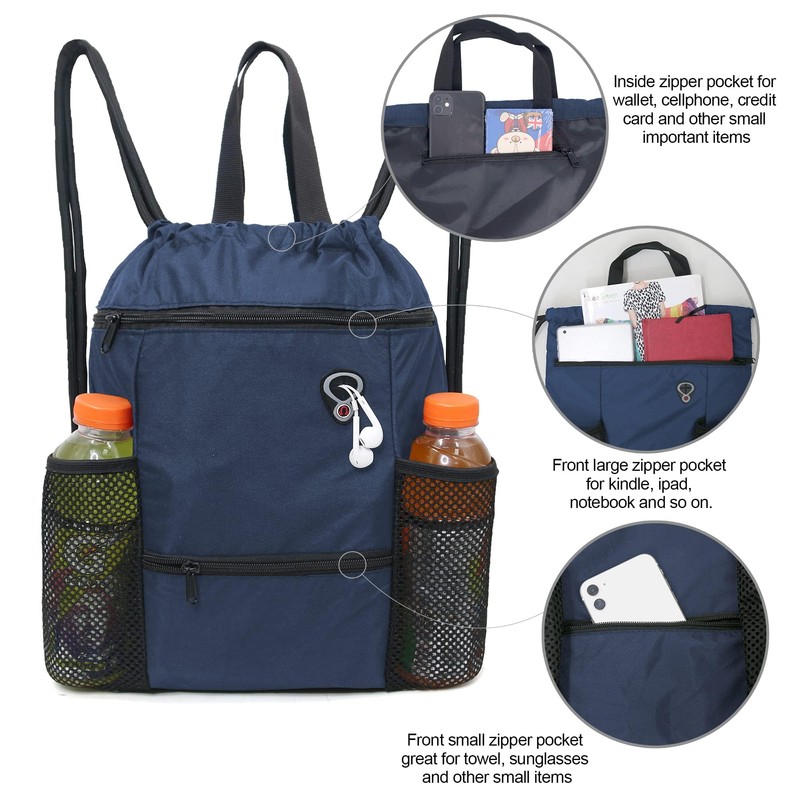 - CONVENIENT MULTI POCKETS:The front large zipper pocket of this drawstring gym backpack for kindle, ipadand so on, the front small zipper pocket great for towel,sunglasses and other small items. Besides, two sides mesh pockets allow you to place a water bottle or umbrella easily. And the inside zipper pocket can hold small valuables such as wallet, cellphone, credit card. etc. This is a drawstring bag for all your daily essentials.