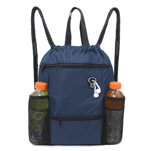 BeeGreen String-Backpack-Bag-Cinch-Bag with Zipper Pockets, Gym Sport Drawstring Bag for Soccer Beach Workout Navy Blue