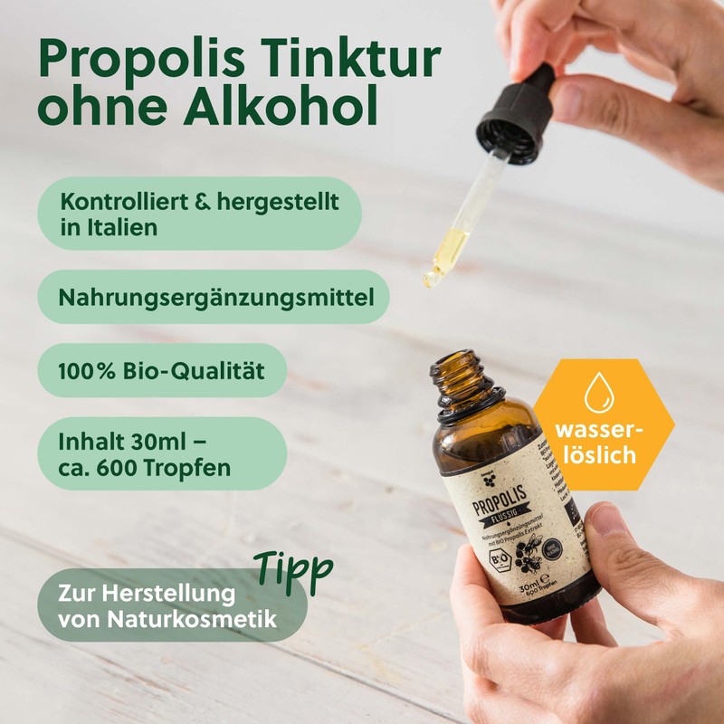 Our drops contain no alcohol and are equipped with 10 percent propolis extract. They are water-soluble and therefore leave hardly any stains on the skin. Above all, water solubility is an advantage in the practical handling, because this makes our propolis tincture ideally dissolve in liquids without the notorious flaking formation.