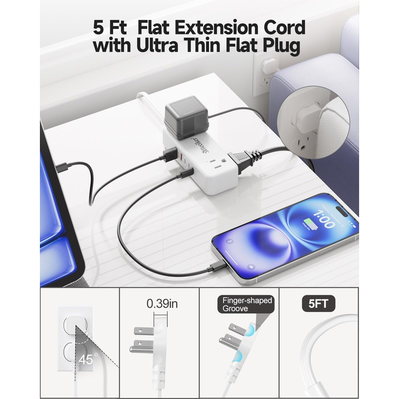 - 【5Ft Flat Extension Cord with Ultra Thin Flat Plug】With 0.39 inch ultra thin plug and 45° right angle design, the extension cord with usb ports can close to the wall easily and hide in the back of furniture, Perfect solution for dorm room,hotal, bedside, behind the sofa,kitchen,office etc; flat extension cord 5ft is made of pure copper, which has better current carrying capacity. Beeiker's Finger-shaped groove design for easier plug and unplug