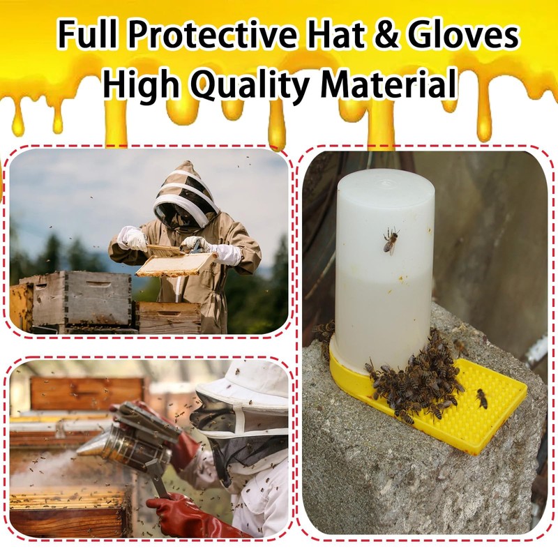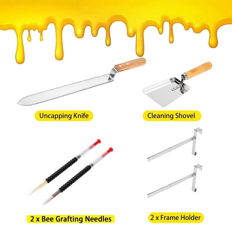 - All-in-One Beekeeping Kit - Enjoy the convenience of having most of the beekeeping tools you need in one comprehensive set. it includes tools for honey uncapping, queen bee catching, honeycomb reinforcement, honey harvesting, and beehive checking and maintaining, as well as protective equipment (veil and gloves).
