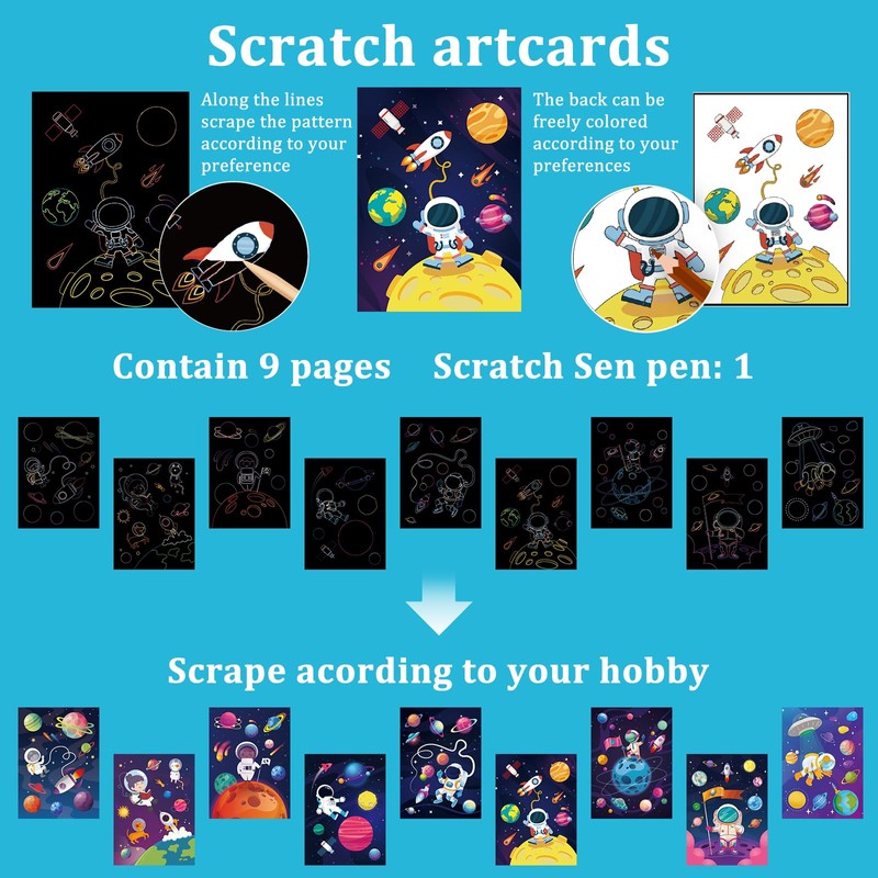 • Scratch pictures set: the scratch paper contains 4 sets of Magic Scratch Book, 9 in each style, total 36, scratch pictures for children size is: 19 x 14 cm. And with 4 scratch painting bamboo sticks. They are qzeane theme, dinosaur theme, animal theme, space theme.