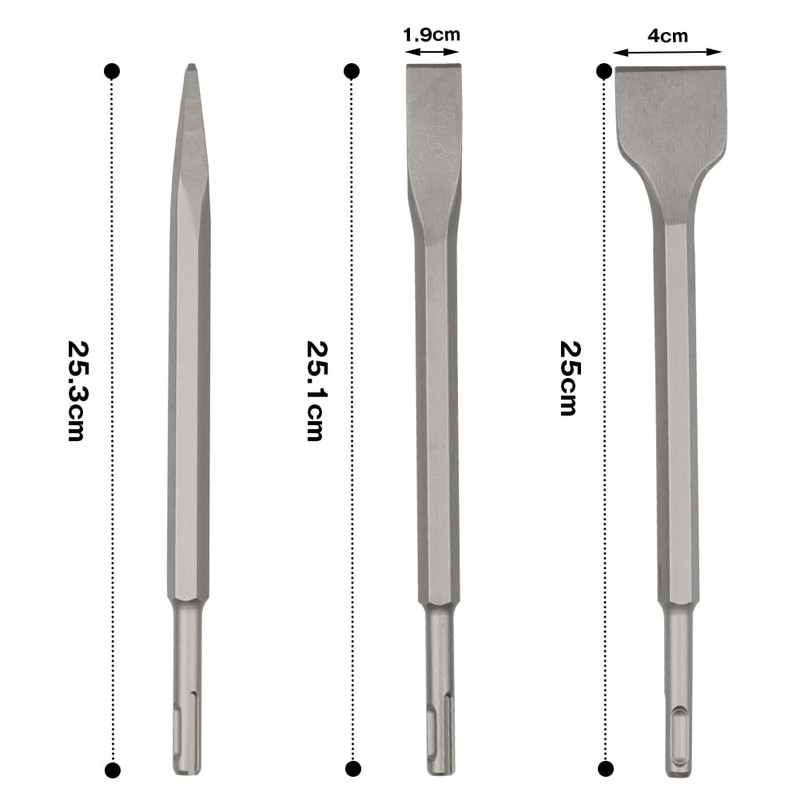 • Set Contents: Flat chisel x 1, cold chisel x 1, Bull point x 1. Effective length: 9.8 - 10.0 inches (250 - 256 mm) SDS Plus chisel