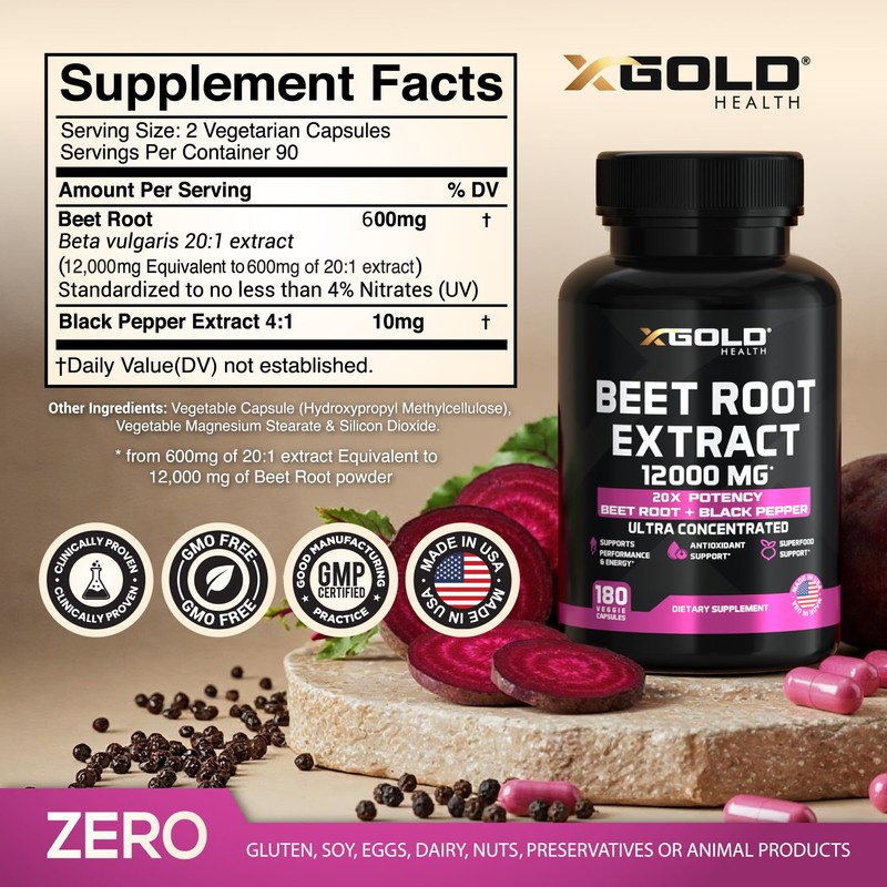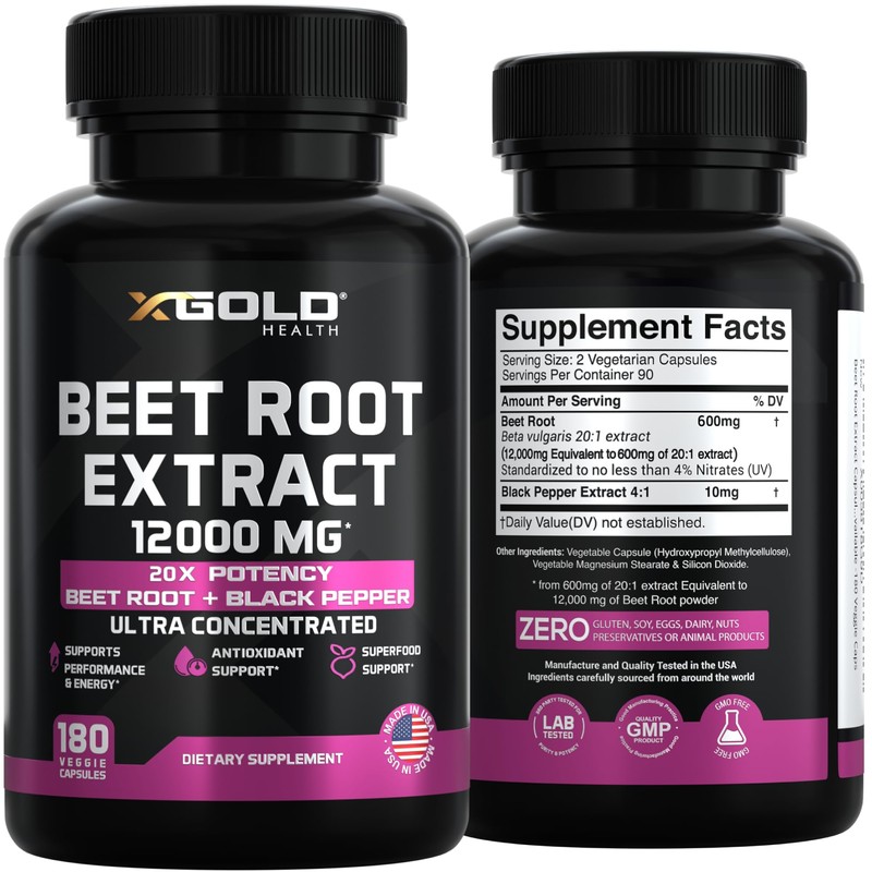 Feeling sluggish or low on energy? Break through your limits with X Gold Health’s ultra-concentrated Beet Root Extract! Our 20:1 Beet Root extract (20x stronger) is packed with nitrates that naturally boost your body’s nitric oxide levels. This enhances oxygen efficiency, endurance, and overall performance. A favorite among athletes like runners, cyclists, and swimmers, Beet Root Extract helps you get into the zone faster, maintain peak performance longer, and recover quickly for your next activity. Whether for intense workouts or everyday activities, this powerful supplement is your key to sustained energy and performance!