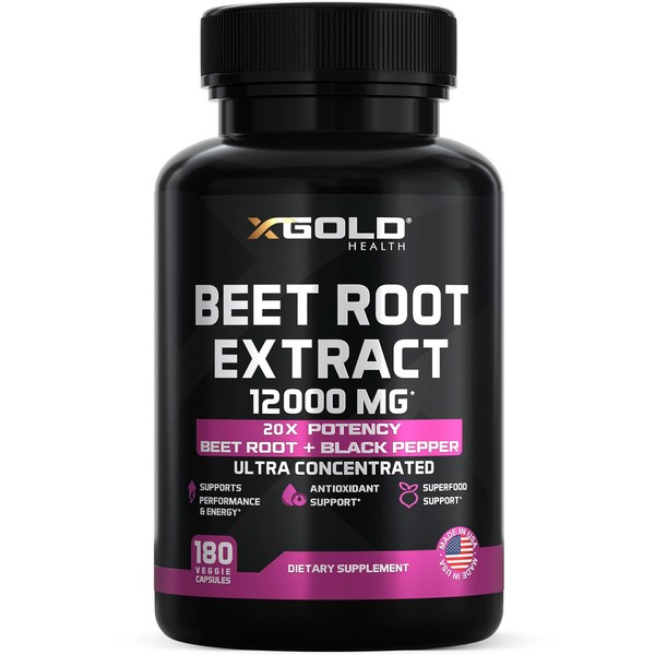 Beet Root Extract Capsules - 12000mg 20x Concentrated Beet Root Capsules Supplement w/Black Pepper - High Nitrates - Natural Nitric Oxide Booster - Highly Concentrated & Bioavailable -180 Veggie Caps