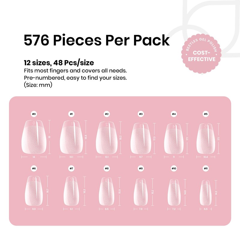 - 【Beetles Soft Nail Tips】You can easily extend your nails and enjoy the fun of DIY acrylic nail tips with Beetles Half Matte gel nail tips! This beetles fake nail tips includes 576 pcs extrashort coffin nail tips, 12 different sizes with 48 nails of each size. The tips are marked with the numbers "0-11" to quickly find your size.The newest, the fastest, most professional, nail enhancement in 2025 new nails.