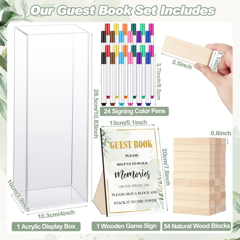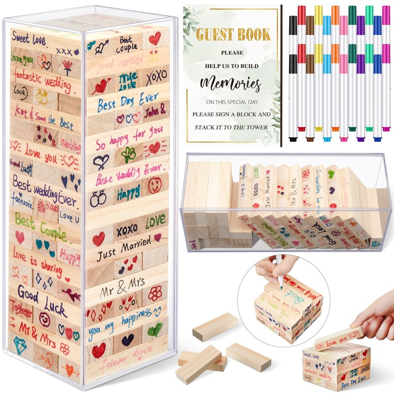 - Complete Set: each set of wedding book includes 54 wood blocks, 1 acrylic transparent box that can just fit all the wood blocks, 1 wooden wedding game sign and 24 signature pens in 12 colors, elegant and simple, easy to receive praise from most people; Each block measures approximately 3.5 x 1.1 x 0.6 inches, and the complete tower is about 10.83 inches tall