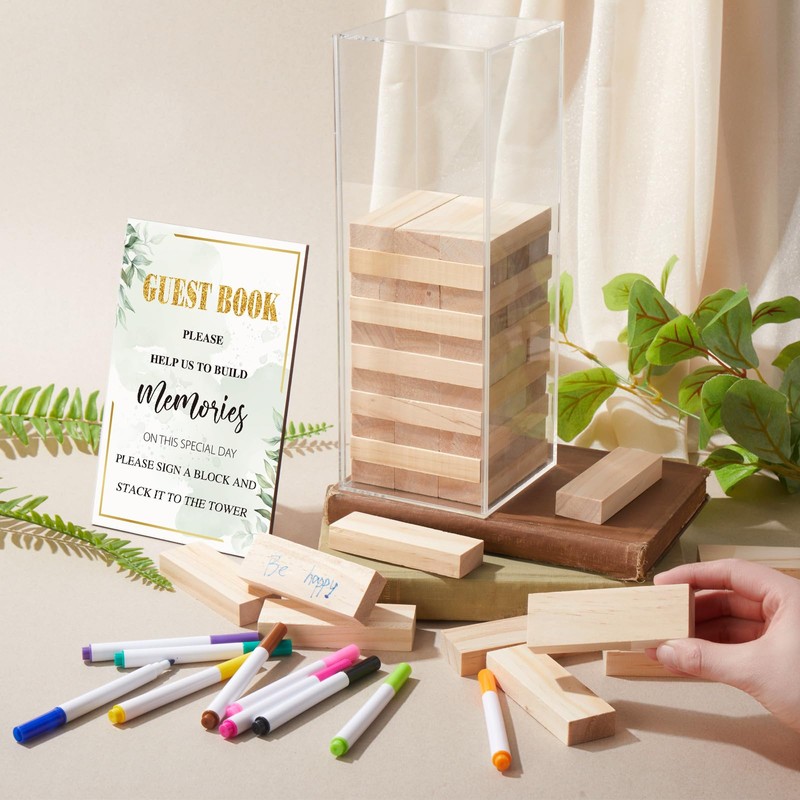 - Create Precious Memories: wooden block guest book for wedding sign in has enough blank space for guests to write names and sincere blessings, which can be stored in a transparent acrylic box; Multiple wooden blocks can build a tower of love to preserve all the beautiful memories; What's more, 12 different color pens are available