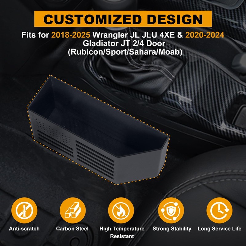 - 【Tool-Free Installation】Designed specifically for Jeep Wrangler JL accessories, this Gear Shift Side Storage Box Tray requires no drilling or modification. Utilizing existing vehicle mounting points, any user can install it in minutes, instantly enhancing the practicality and organization of your Jeep Gladiator accessories.