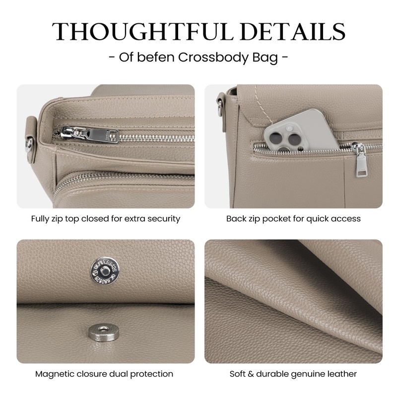 - Genuine Leather Purse: The befen saddle crossbody bags for women made from full grain cow leather, it's durable, scratch-resistant, and soft to the touch. Fine workmanship, premium silver-tone hardware and smooth zipper ensure leather purse keep beautiful for years to come