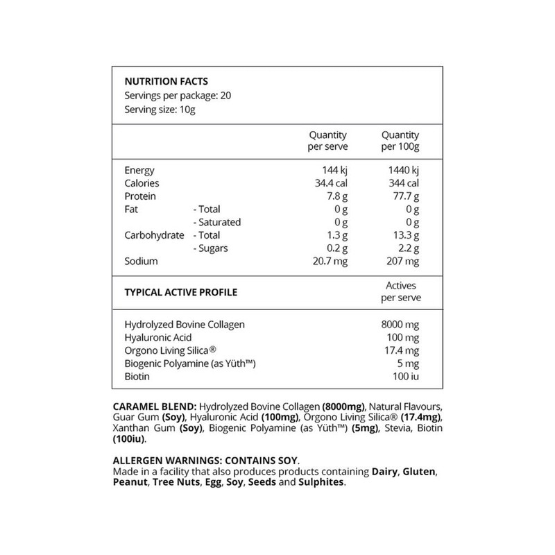 Hydrolyzed Bovine Collagen (8000mg), Natural Flavours, Guar Gum (Soy), Hyaluronic Acid (100mg), Orgono Living Silica® (17.4mg), Xanthan Gum (Soy), Biogenic Polyamine (as YüthTM) (5mg), Stevia, Biotin (100iu).
