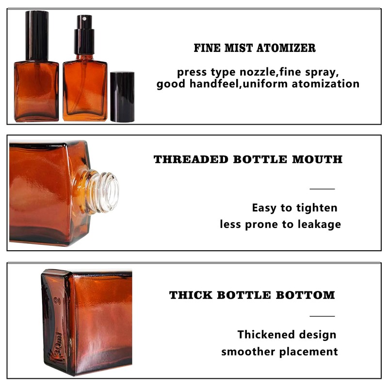 - High-quality material:these amber square spray bottles are made of thickened glass,with black aluminum atomizer and dustproof caps .amber glass bottle provides protection from harmful ultraviolet rays preserving