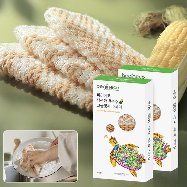 Begin Eco biodegradable corn mesh scrubber 3 sheets 2 boxes total 6 sheets / plastic free / 비긴에코 생분해 옥수수 그물망수세미 3매 2박스 총6매 / 플라스틱프리
