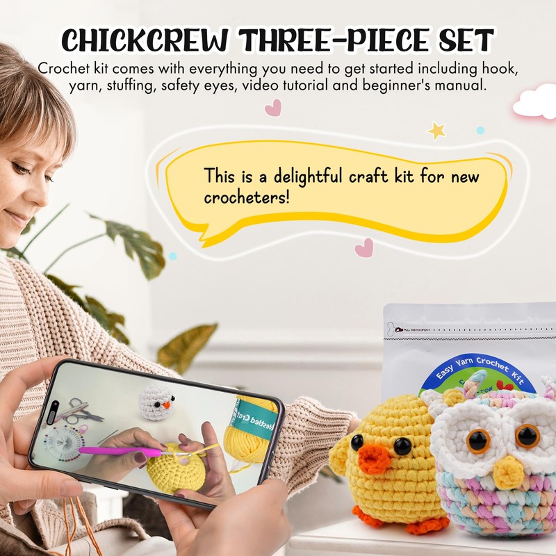 Beginner Crochet Kit, Crochet Kits for Adults, Crochet Starter Kit with Step-by-Step Video Tutorials, Yarn, Eyes, Stuffing, Crochet Hook, Crochet Animals Kits DIY Craft Knitting Kit (Chickcrew+Hootwin)