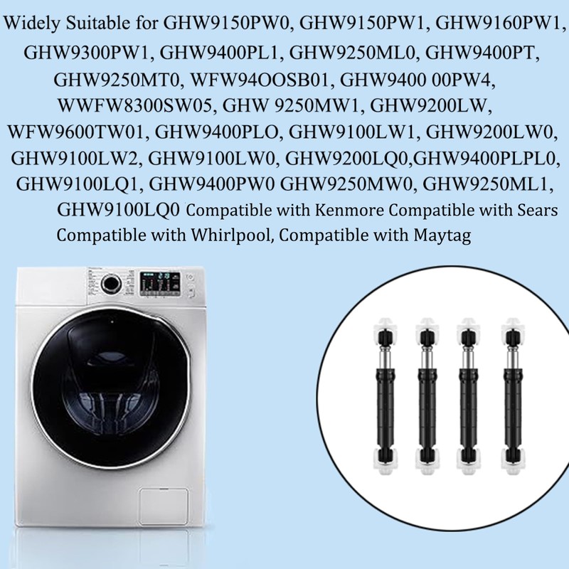 - 【Strong Compatibility】This washing machine shock absorber is widely suitable for GHW9150PW0, GHW9150PW1, GHW9160PW1, GHW9300PW1, GHW9400PL1, GHW9250ML0, GHW9400PT, GHW9250MT0, WFW94OOSB01, GHW9400 00PW4,WWFW8300SW05, GHW 9250MW1, GHW9200LW, WFW9600TW01, GHW9400PLO, GHW9100LW1, GHW9200LW0, GHW9100LW2, GHW9100LW0, GHW9200LQ0, GHW9400PLPL0, GHW9100LQ1, GHW9400PW0 GHW9250MW0, GHW9250ML1, GHW9100LQ0 Compatible with Whirlpool, Compatible with Maytag and Compatible with Kenmore Compatible with Sears
