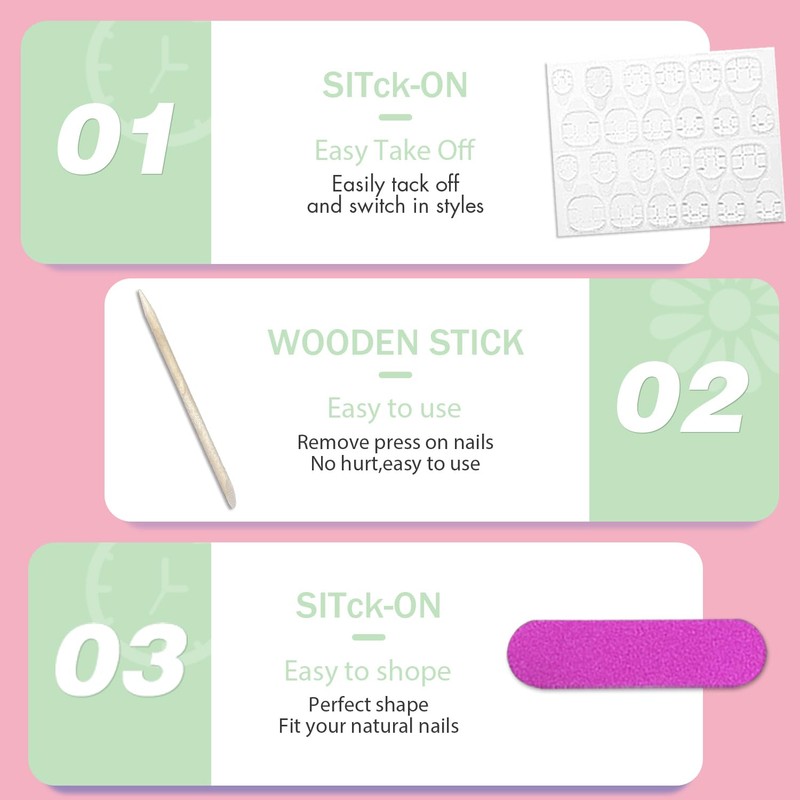 2.Please note that the nail glue is not included.If you want it last for a longer time,please use nail glue instead of the nail stickers.