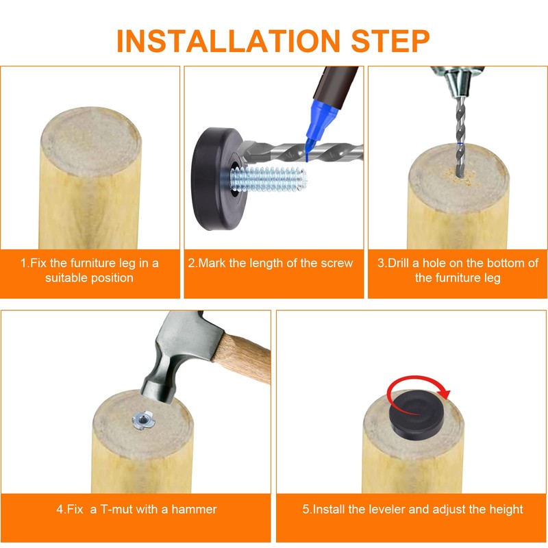 - 【Easy to install】The adjustable cabinet levelers can provide a convenient installation process with simple screw-on structure and light weight. (Warm Reminder-It's easy for wooden furniture, if for metal furniture legs,it requires welding or riveting of 1/4 thread inserts, non-pros please don't operate.