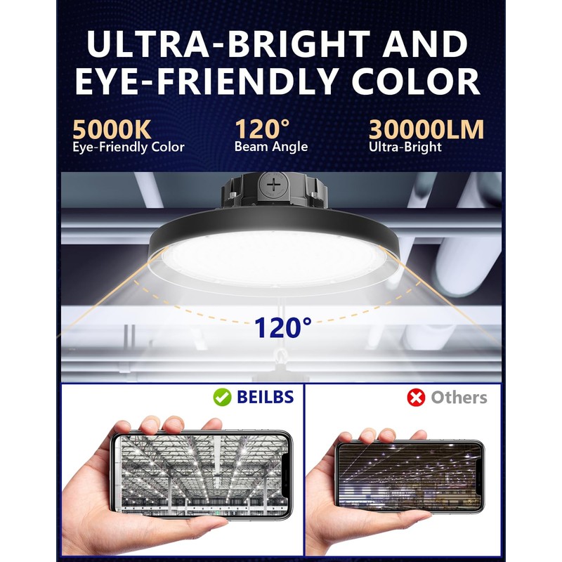 - Ultra-Bright and Eye-Friendly Color: BEILBS UFO LED High Bay Light bulid with no flicking commercial-grade LED, offers a 150LM/W efficiency, natural 5000k daylight-like illumination and 120° beam angle ensures wide&clear visibility and reducing eye strain,making it perfect for work environments, warehouses, and industrial settings