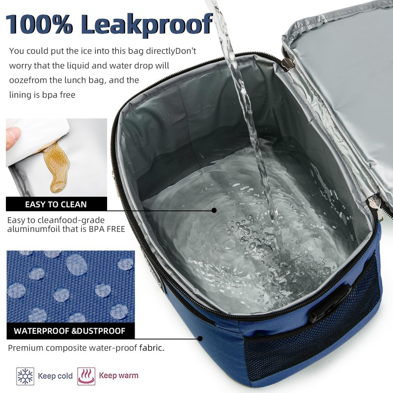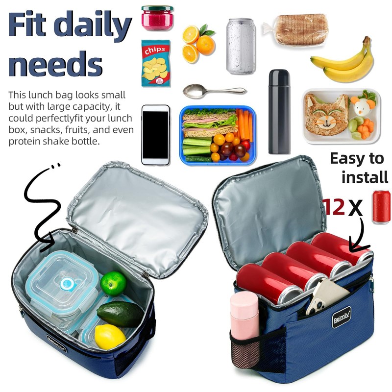 • Large capacity lunch bag:8L men's and women's insulation lunch bag, the size is 10.2 × 6.8 × 7 inches, which can accommodate 12 bottles of 335 ml. The soft cooler lunch bag provides you with spacious storage space. You can put in lunch, snacks, drinks, lunch boxes, food containers, condiments, fruit salads, etc. The front pockets are placed in a tableware, a napkin, a bottle, a wallet, a key and other necessities, and then placed the water bottle or energy drink in the side grid pocket.
