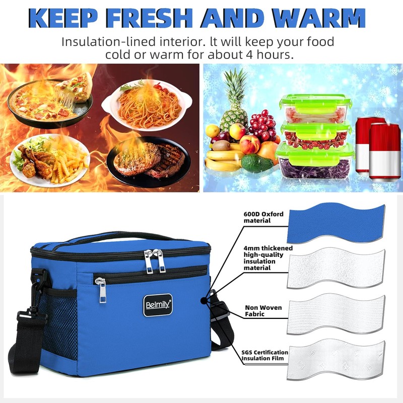 BEIMILY lunch bag is soft sided lunch box bag with an adjustable shoulder strap and handle, and a main bag with a capacity of 8 liters. A front zipper pocket can hold napkins, tableware, spoons, forks, knives, and other small items. The interior is made of aluminum foil, and the main bag is made of environmentally friendly PEVA material. The design of the aluminum foil layer can effectively keep warm or cold for several hours, and the inner layer is made of food-grade PEVA material, which is non-toxic, safe, and environmentally friendly. The lunch bag is suitable for various occasions such as work, picnic, beach, and travel.