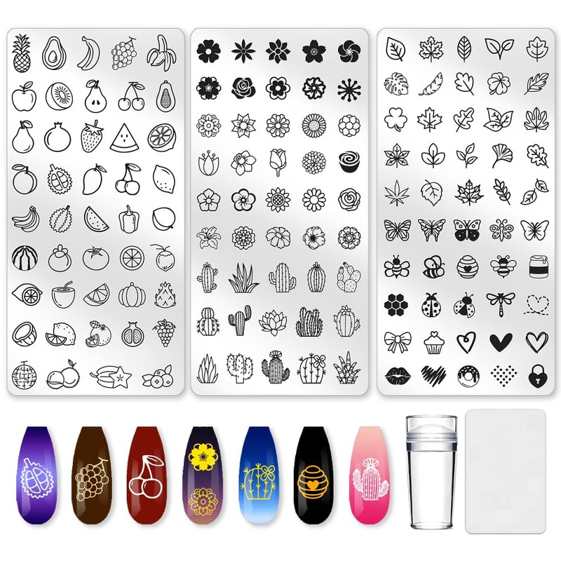 beinkmake 3Pcs Fruits Flower Nail Stamping Plate Leaves Cactus Bees Nail Stamp Templates Nail Art Stamp Plates Image Plate Stainless Steel DIY Reusable Tools with Stamper Scraper for Manicure Printing