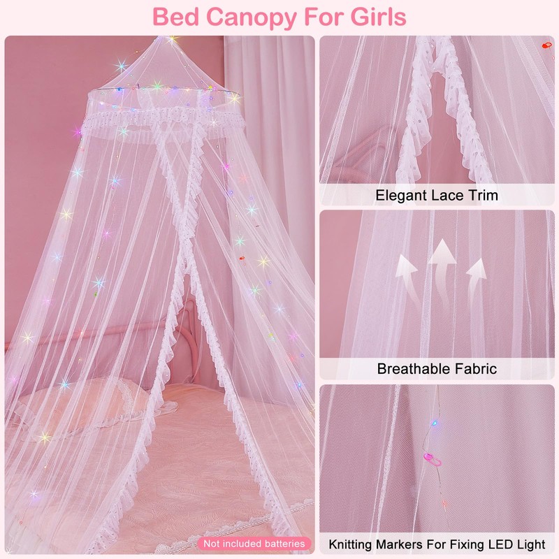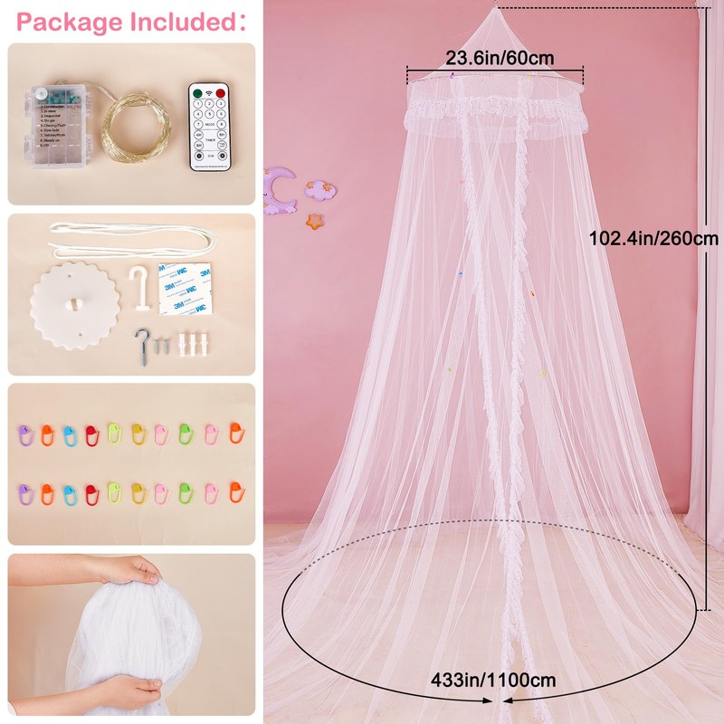 - Functional Remote: The colorful lights of bed canopy for girls can be controlled with a remote; It has 3 timer modes (4 hours on/6 hours on/8 hours on); Create a private space for children's sleep and no longer afraid to turn off the lights when they go to sleep