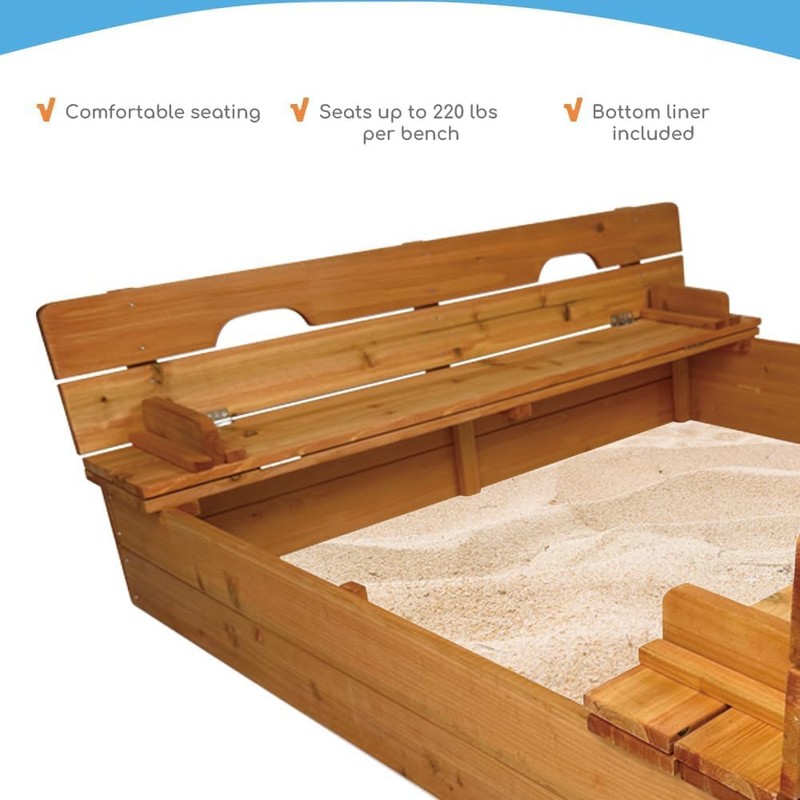 - Spacious and Comfortable: This sand pit has a large 48'' space for several children to play together. The bench provides reliable seating up to 220 lbs. And the reinforced backrest prevents kids from falling backward while playing.