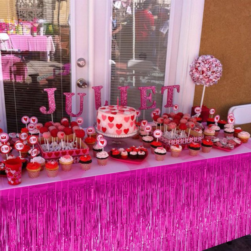 BEISHIDA 2 Pack Metallic Tinsel Foil Fringe Table Skirts for Rectangle & Round Tables Hot Pink Kids' Birthday, Holiday Cartoon Party Decorations for Birthday Valentines Baby Shower Festive Events