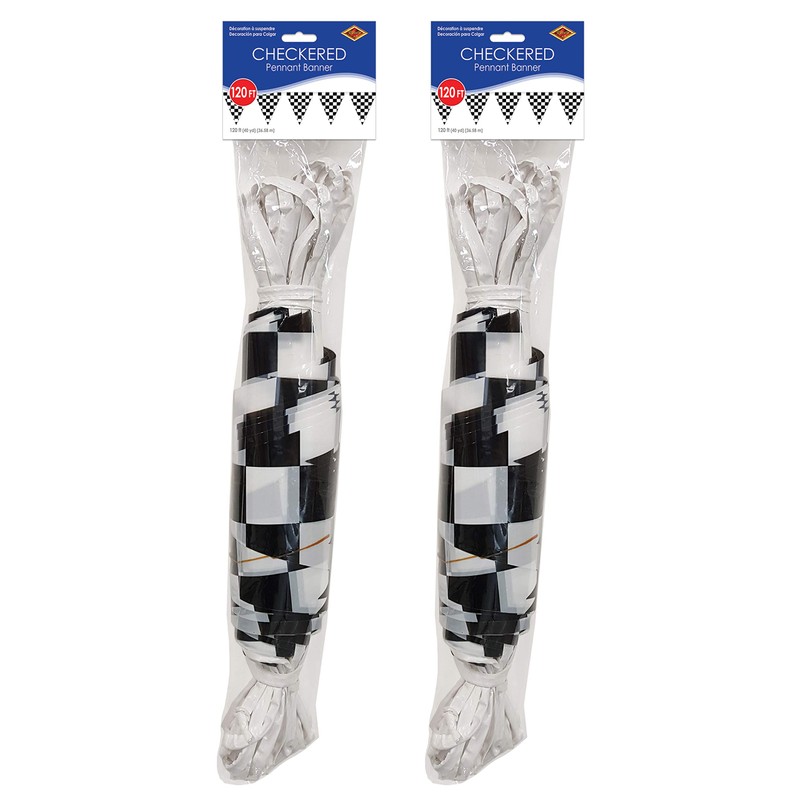 Beistle S50701AZ2 checkered pennant banner. The package contains 2 pennant banners. Each pennant banner measures 17 inches long by 120 feet wide. They are made of all-weather plastic. Each banner has 65 checkered pennants on a string. Hang these pennant banners up to decorate for a racing or sports event!