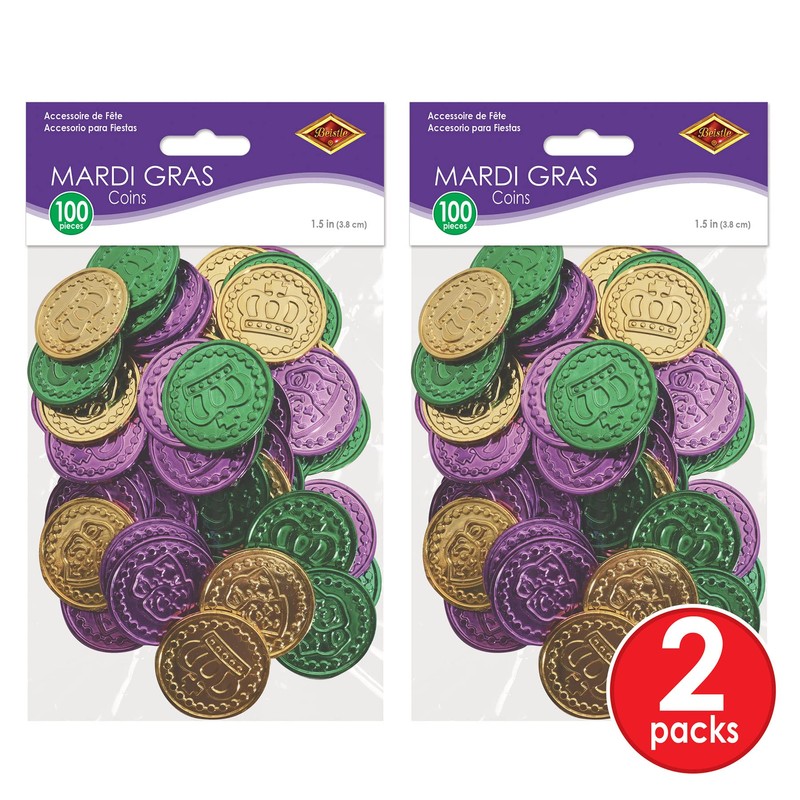 Beistle 200 Piece Plastic Mardi Gras Coins with Embossed Design Pirate Treasure Hunt Party Favors Fake Casino Theme Money, 1.5", Green/Gold/Purple