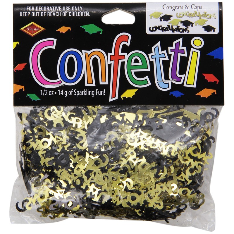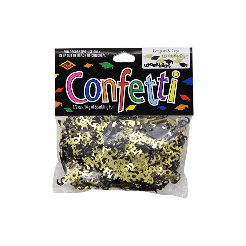 Beistle CN020 Congrats and Caps Confetti. This package contains small pieces of "Congratulations" and graduation caps in black and gold colors. There is a half ounce of confetti in the package. Spread this confetti on tables to decorate for graduation parties!.