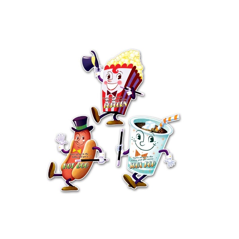 Beistle 57464 Movie Night Cutouts (3 Count). These cutouts are really cute and fun! There are three colorful designs - a hot dog, popcorn and soda pop. They are 18 Inch tall, printed on both sides and made of board stock.