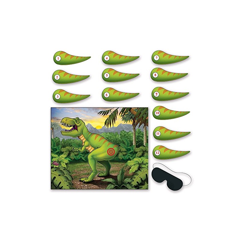 - Made of plastic material. Each package includes: (1) dinosaur picture – 18 in by 21 ½ in. (1) blindfold mask. (12) numbered tails