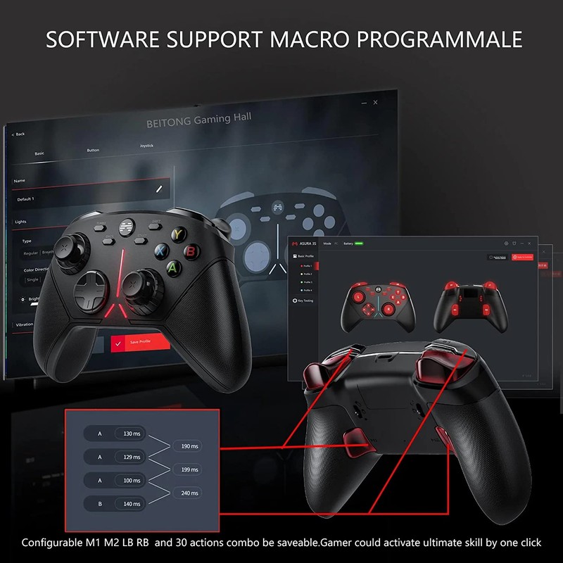 - Configable LB RB M1 M2 Button and Software Programmable PC Wireless Game Controller: Custom Programming achieve gamers efficient operation skills,one-click activate super nirvana;Rear paddles can be set to whatever buttons your heart desires. Awesome for games like Elden Ring or using as paddle shifters in racing titles